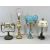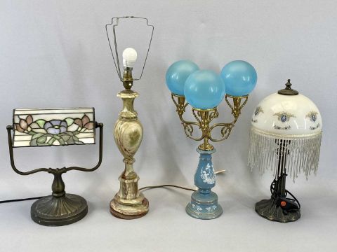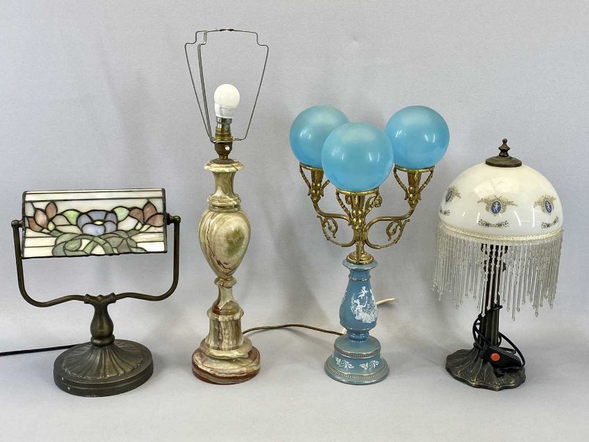 ALABASTER TABLE LAMP, 38cms H excluding fitting, Italian ceramic three branch table lamp with gilded fittings and three turquoise globular glass shades, 47cms H, an Art Nouveau style table lamp with opaque glass shade having glass bead drops, 43cms H and another desk lamp with Tiffany style shade, 32cms H