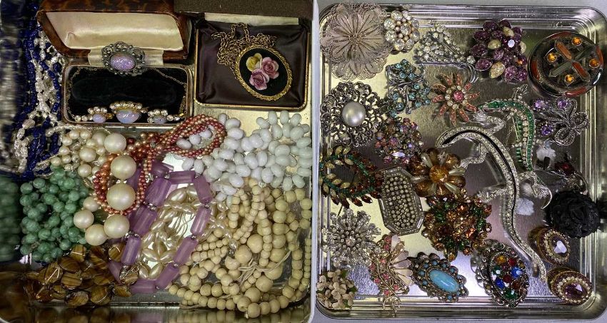 COLOURFUL SCOTTISH AGATE, Irish bog oak and other quality brooches, necklaces and other jewellery group, lot includes a good size circular brooch inset with colourful agates and cabochon amber colour glass, 5cms diameter, Birmingham 1967 hallmarked ribbon brooch with facet cut amethyst colour stones and marcasites, sterling silver Scottish thistle brooch, possibly silver and paste set salamander brooch with a larger white metal similar item, a circular carved Irish bog oak brooch, 3.5cms diameter, foil back jewellery, bone bead necklaces, ETC