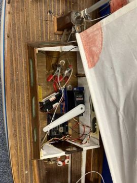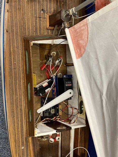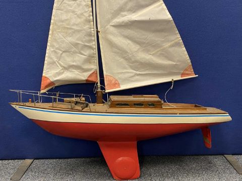 SCALE MODEL YACHT - 'Del Bach', of wooden construction, with cream and red hull, red weighted keel with remote control electric motor, 154cms H, 112cms L