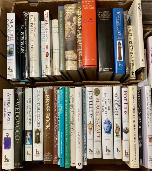 BOOKS - Antique hardback and collector's Reference books to include 'Antique Collector's Club', 'Collector's Clocks', 'Pot Lids', 'Royal Jewels' (within 5 boxes)