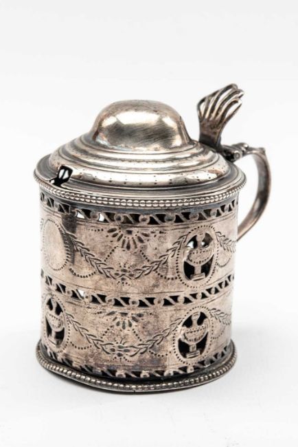 ASSORTED SILVER comprising Hester Bateman silver mustard pot, London, silver stamp holder, Birmingham 1912, F. Webb, boxed silver handled butter and cheese knivesProvenance: private collection Carmarthenshire
