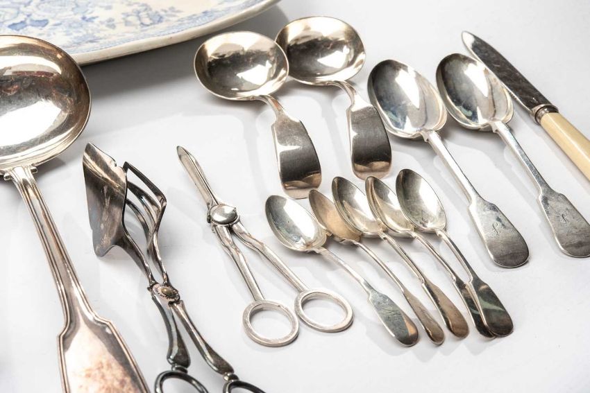 ASSORTED SILVER, ELECTROPLATE & CERAMICS, to include pair George V tablespoons, six various antique silver teaspoons, plated soup ladle, pair plated sauce ladles, plated grape shears, boxed five piece carving set with antler handles (box distressed), three Staffordshire blue printed meat plates and a concertina