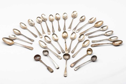 ASSORTED ANTIQUE SILVER SPOONS, to include various teaspoons and condiment spoons, various hallmarks, wt. 13.25 ozt approx. (qty)Comments: some heavily tarnished/worn