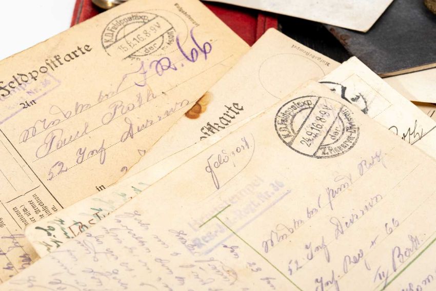 ASSORTED MILITARIA comprising tin of cap badges relating to Royal Welsh Fusiliers, Egypt SWB, Singapore Volunteer Corps, York and Lancaster, West Yorkshire, GWR enamel badge, studs and a wallet of German related militaria including military postcards, booklets and a West Yorkshire signed menuProvenance: deceased estate Swansea, consigned via our Carmarthen Office