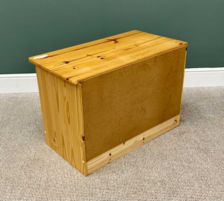 MODERN PINE FURNIUTURE ITEMS (2) - to include a three drawer chest with turned wooden knobs and shaped lower apron, 57cms H, 85cms W, 46cms D and a rectangular coffee table on block and turned supports, 43cms H, 104cms W, 50cms D