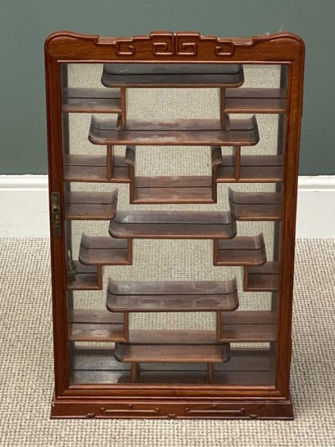 CHINESE HARDWOOD WALL HANGING DISPLAY CABINET - having a single glazed door with multi-shelf and mirrored back interior, 78cms H, 46cms W, 10cms D