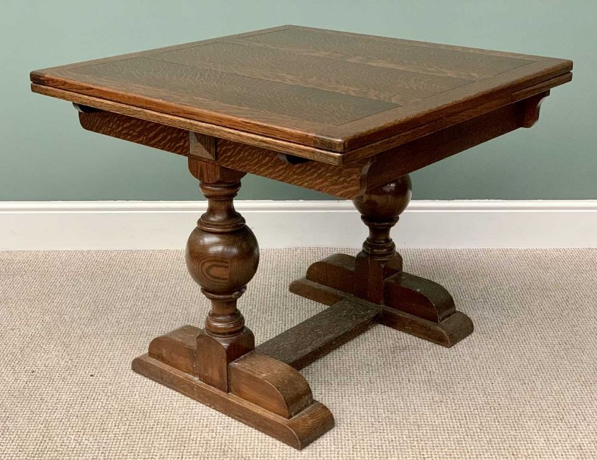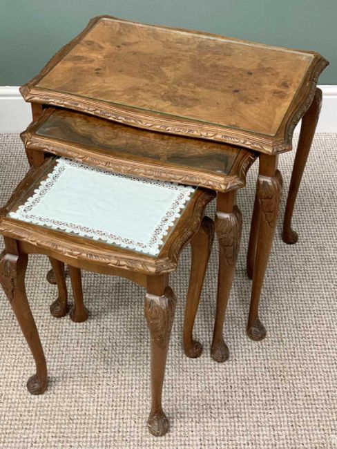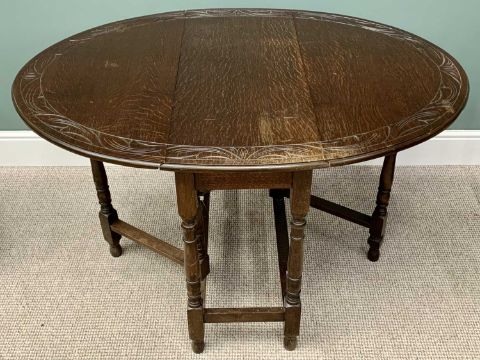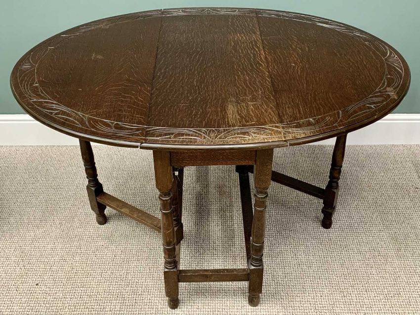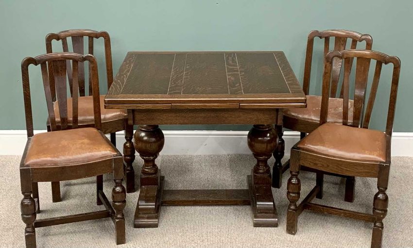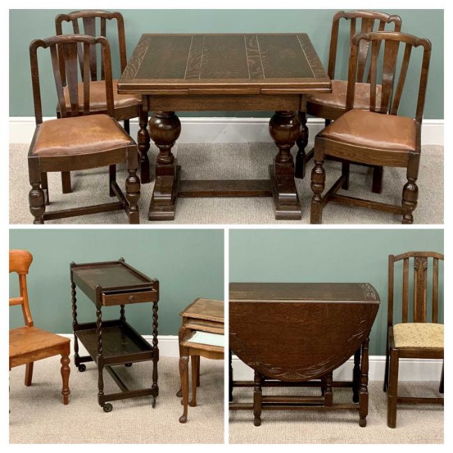 FURNITURE PARCEL (7) - oak draw leaf table with bulbous end supports, 75cms H, 153cms W (open), 91cms D, four oak framed dining chairs with shaped railbacks, 86cms H, 46cms W, 39cms D, a gate leg table, the oval with carved detail, turned supports, 73cms H, 123cms W (open), 90cms D, two oak railback chairs with floral upholstered drop-in seats, 88cms H, 45cms W, 38cms D, an oak two tier tea trolley with end drawer and twist turned supports, 79cms H, 68cms W, 37cms D, a single wooden chair, 92cms H, 46cms W, 34cms D and a reproduction mahogany nest of three glass topped tables with slender cabriole supports, 56cms H, 58cms W, 42cms D