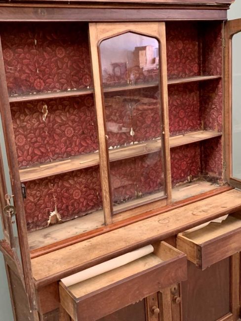 OAK & MAHOGANY BOOKCASE CUPBOARD - late 19th Century, the upper section having three arched glazed doors with interior shelves, the base having two drawers over a double cupboard with panelled doors, 217cms H, 145cms W, 48cms D