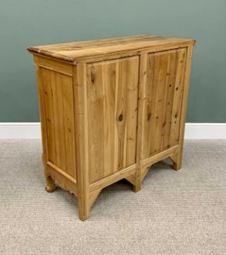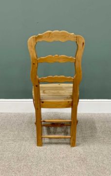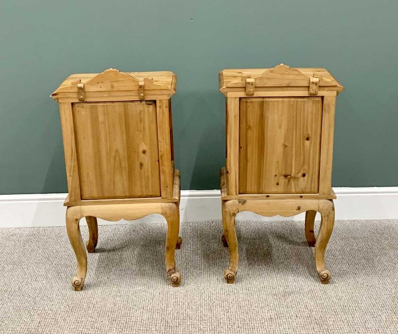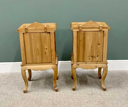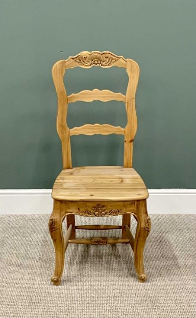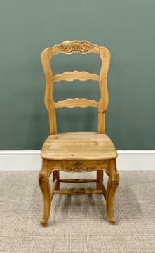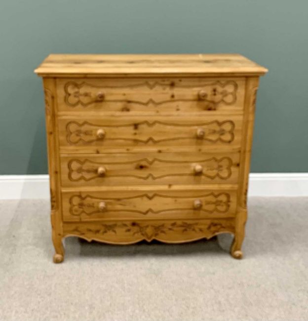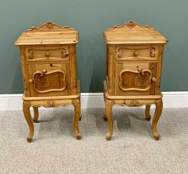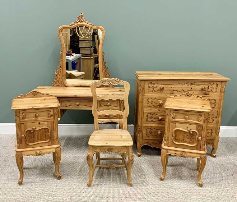 CONTINENTAL STYLE ANTIQUED PINE BEDROOM FURNITURE - five items to include a four drawer chest, 103cms H, 107cms W, 48cms D, mirrored dressing table, 163cms H overall, 120cms W, 50cms D and a pair of single drawer, single door railback bedside cabinets, 91cms H, 48cms W, 38cms D along with a similarly styled dressing table ladderback chair, 103cms H, 44cms D, all items having carved detail and shaped supports