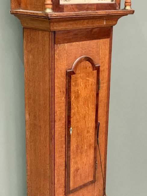 W ROBERTS, TAUNTON, OAK & MAHOGANY LONGCASE CLOCK - mid 19th Century, signed arched painted enamel dial with subsidiary seconds dial and date aperture before a twin weight pendulum driven bell strike movement, (pendulum and weights included), the hood with broken swan neck pediment and turned pilasters flanking a single glazed door, the trunk with arched door over a stepped base, 216cms H, 47cms W, 23cms D