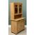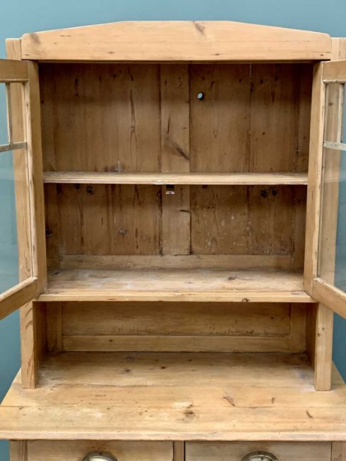 PINE KITCHEN DRESSER - neat proportions, the upper section with twin glazed doors enclosing a shelf lined interior, the base with two top drawers having brass cup handles and double cupboard below, 194cms H, 100cms W, 55cms D