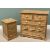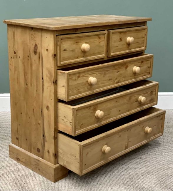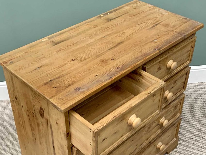 MODERN PINE BEDROOM CHEST - rectangular top over two short and three long drawers with turned wooden knobs, 91cms H, 92cms W, 45cms D and a PINE THREE DRAWER BEDSIDE CHEST - 83cms H, 41cms W, 40cms D