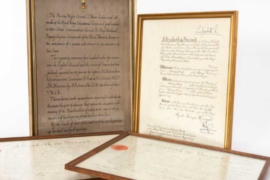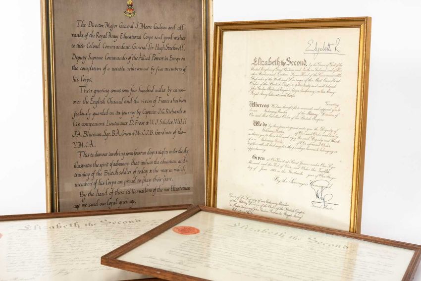 TO JOHN GORDON RICHARDS, R.A.E.C., a hand-written presentation document from Major General S. Moore congratuating J G Richards and others on the achievement of a 400 mile canoe expedition, accoss the Channel and rivers of France over 14 days and nights, with engraved presentation plaque dated 1961, together with three Elizabeth II commisions for 2nd Leiutenant, Captain and Major (1956-1965) to the same, with blindstamps and facsimile signatures, framed (4)