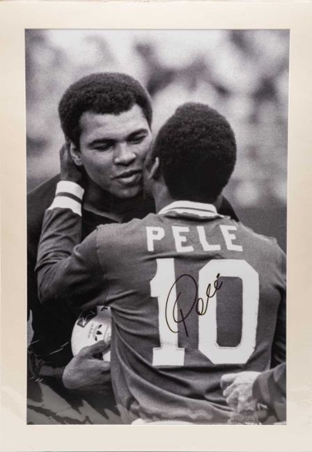 A BLACK & WHITE PRINT OF PELE EMBRACING MUHAMMAD ALI - signed Pelé, together with an A1 Sporting Memorabilia certificate of authenticity, mounted but unframed, 74 x 49cms