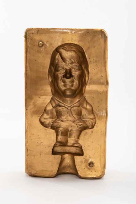 A RARE GROGG MOULD BY JOHN HUGHES FOR A CARICATURE OF BARRY JOHN in gold paint with impressed 'No.10 BARRY JOHN', the reverse incsribed with verse from Max Boyce's '..The Outside Half Factory', in pen; But now the belts are empty, came a sadness with the dawn. And the body-press is idle, and the valley's blinds are drawn. Disaster struck this morning, when a fitter's mate named Ron, Cracked the mould of solid gold,