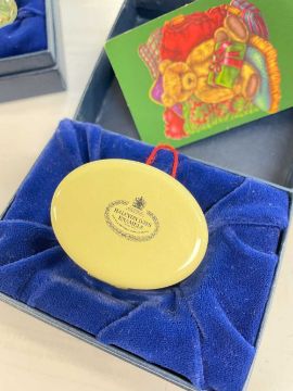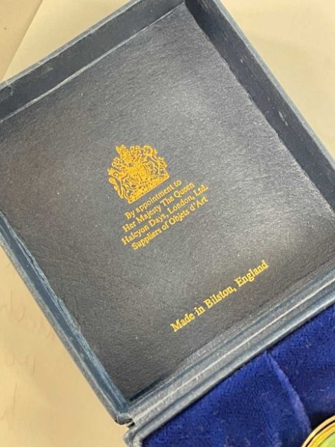 TWO HALCYON DAYS ENAMEL BOXES, comprising oval box with hinged cover, decorated with St Kew Barton Farm, Cornwall, 1998, inscribed to the inside cover 'Presented by His Royal Highness The Prince of Wales', 5.4xm diam.,in presentation box with gilt Prince of Wales feathers and with hand written gift card 'Billy, Happy Christmas with best wishes from Camilla P B'; and circular pill box, decorated with Dovecote, Highgrove House, presented by His Royal Highness The Prince of Wales, 3cm diam. in presentation box (2)