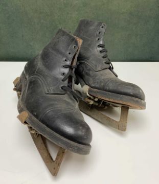 ASSORTED VINTAGE ICE SKATES including two pairs attached to Stead & Simpson black leather boots, pair blades stamped 'Puck', a German 'The Caledonia' pair blades, two other pairs of blades (6)
