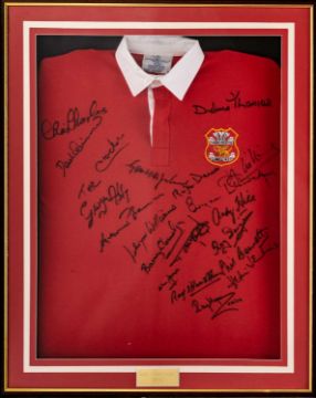 A FRAMED LLANELLI RFC REPLICA SIGNED JERSEY in the 1970s style, signed by approximately 25 x former players including Phil Bennett, Delme Thomas, Derek Quinnell