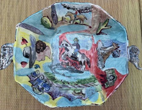 Thomasin Toohie. “Western Adventure”. White earthenware ceramic dish. 11”.x 8” (h).