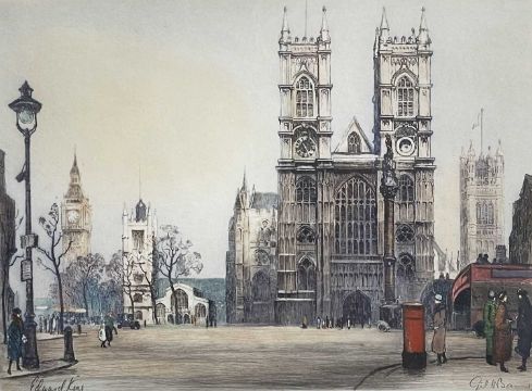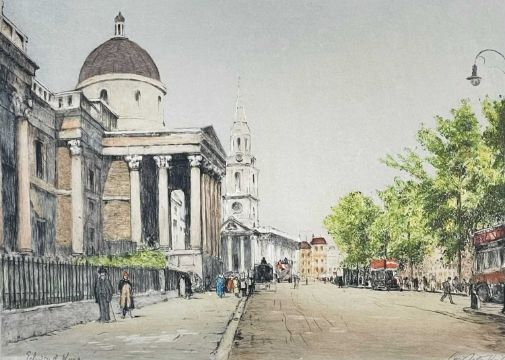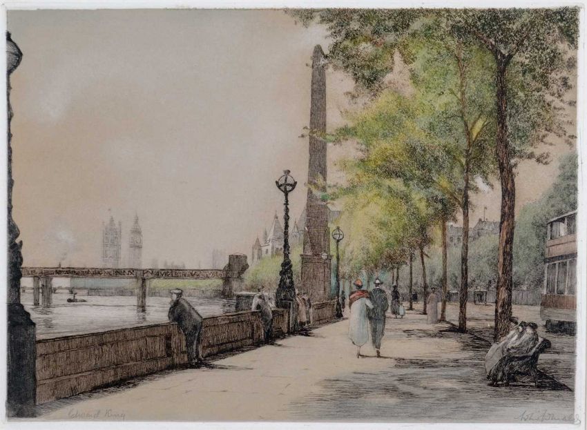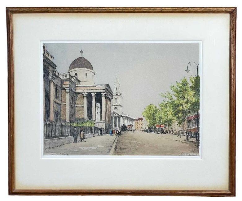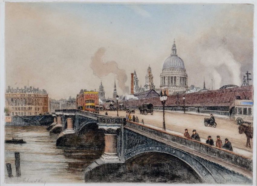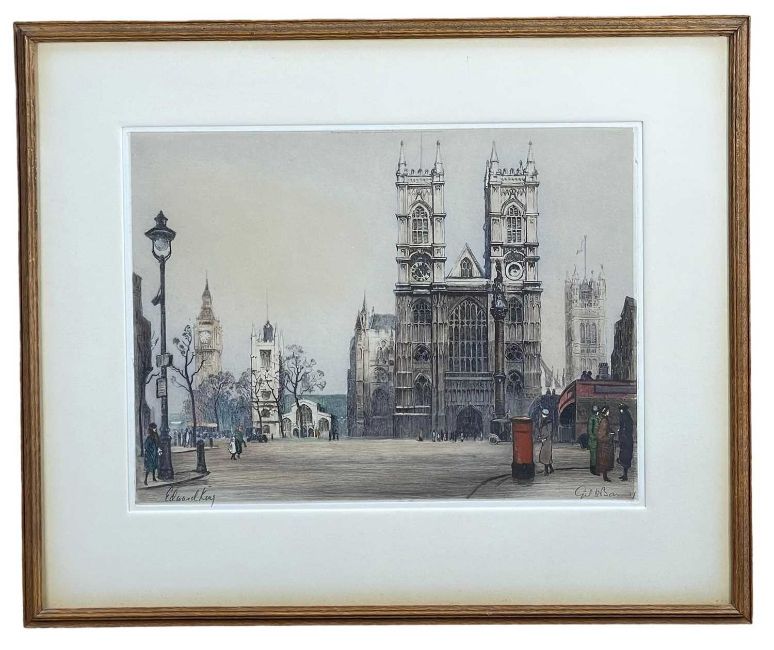 AFTER EDWARD KING, etchings with colour - 'Blackfriars Bridge' & 'Westminster Abbey' etched by C. H. Barraud, 'Victoria Embankment' etched by Dr. D. Donald, 'National Gallery' etched by C.Tatton Winter, signed in pencil, Museum Galleries labels verso, (PL) 26.5cm x 36cm (4)