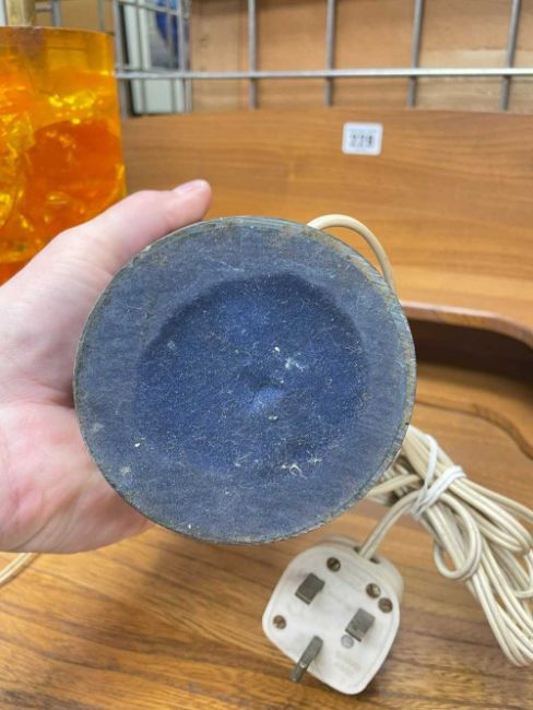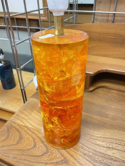 TWO MID-CENTURY 'SHATTERLINE' ACRYLIC TABLE LAMPS, c.1960s, one in orange, the other in blue, with crystalline appearance, largest 25cms high (excluding fitting) (2)