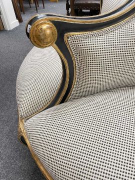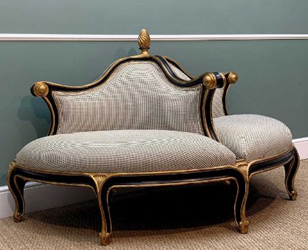 CHRISTOPHER GUY DOUBLE CONVERSATION SOFA, with ebonised & gilt detail, 165 cm long