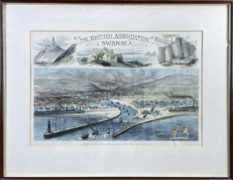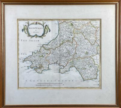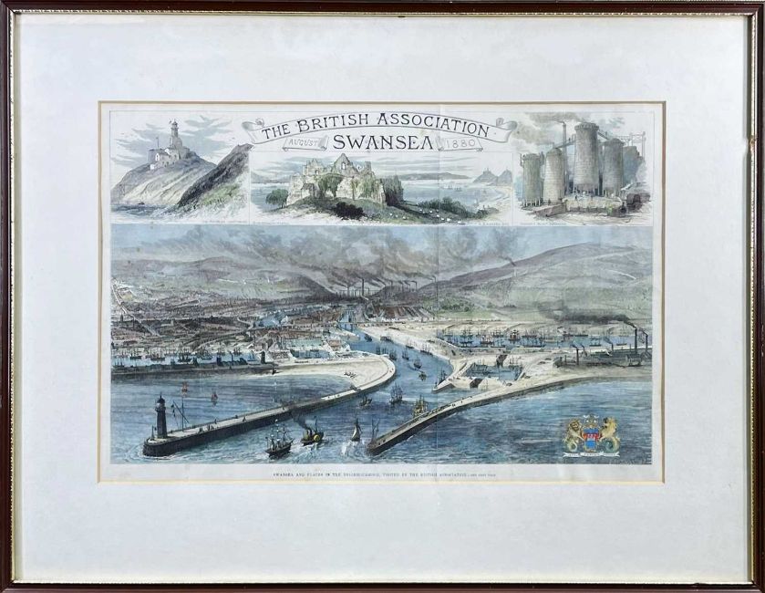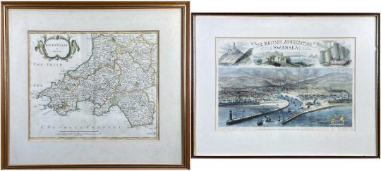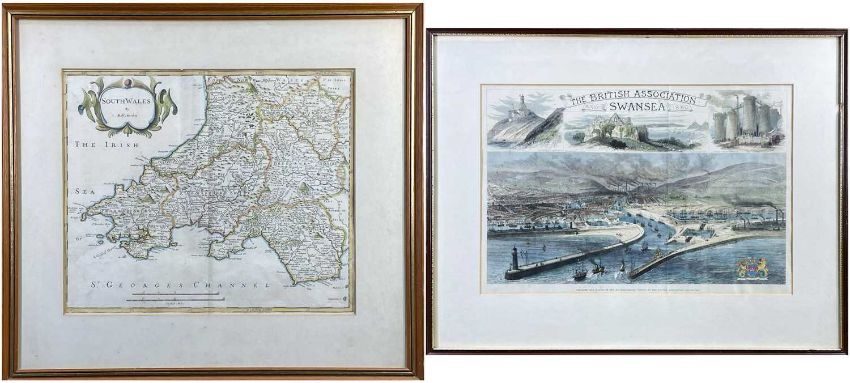 ROBERT MORDEN coloured antique map 'South Wales', 35 x 43cms (framed and glazed); together with coloured engraving entitled 'The British Association - Swansea, August 1880', 34 x 50cms (2)