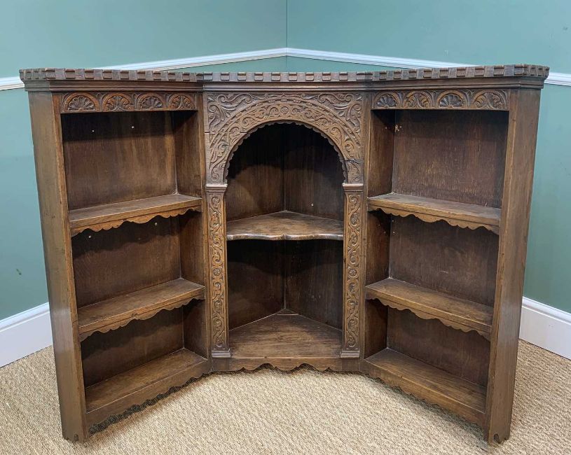 17TH CENTURY STYLE OAK CORNER DRINKS BAR, triple panelled bar base with carved arched front and hanging shelves similar, bar 147cm w, shelves 109cm h (2)