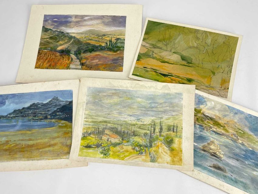 RONALD LOWE (British 1932-1985) watercolours on paper - five Continental landscapes including one entitled "Below Peralta, Tuscany", all unframed but mounted on card, the largest 21 x 29cms