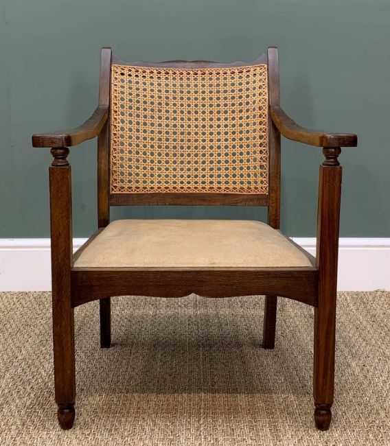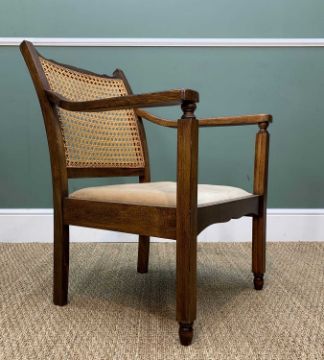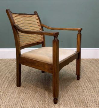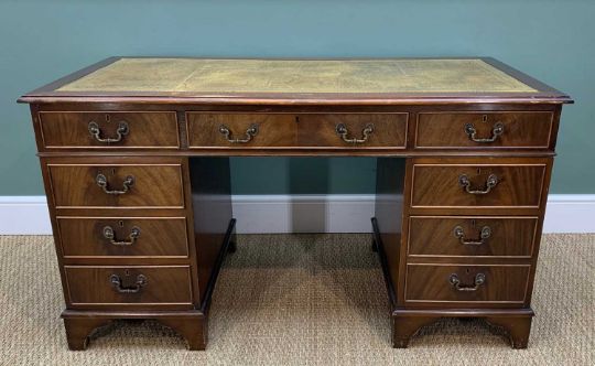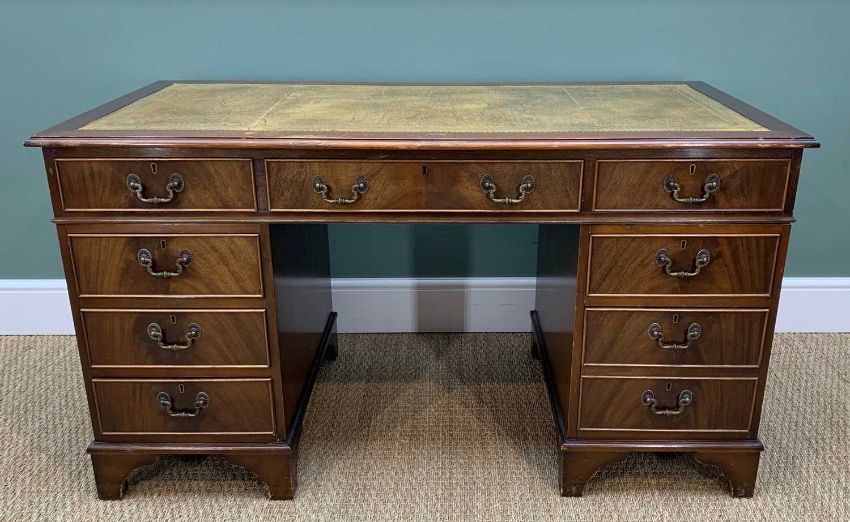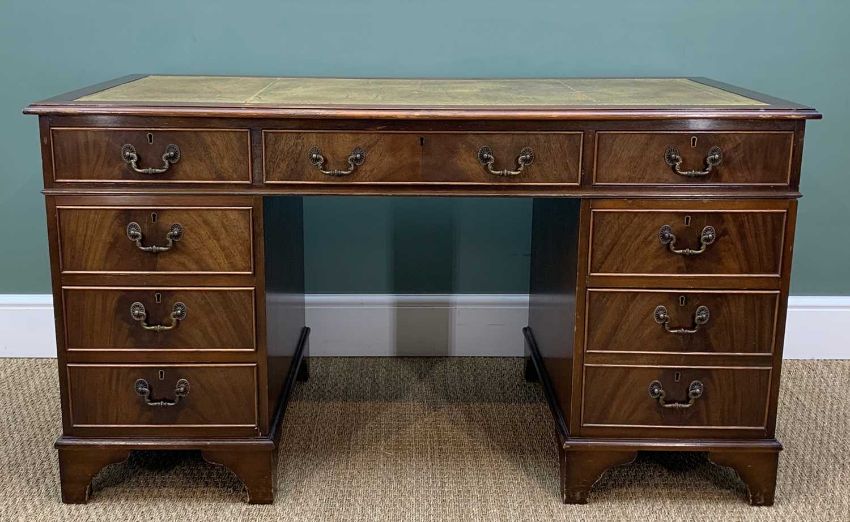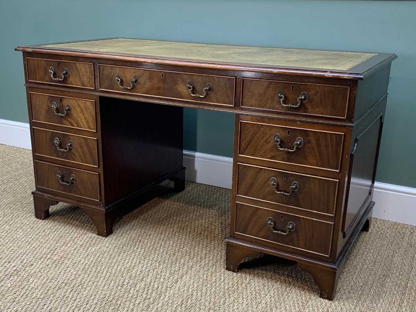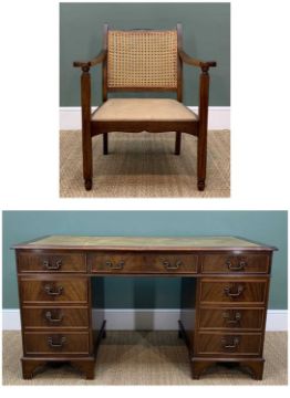 REPRODUCTION VICTORIAN STYLE MAHOGANY PEDESTAL DESK, gilt tooled leather inset top above 9 drawers, 137cm w, and a caned armchair (2)