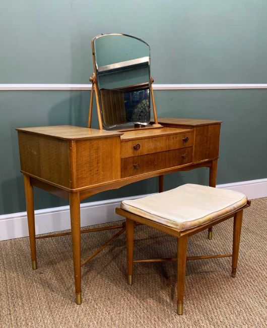 SHIRLEY SLATER FOR HEALS 'C5048' EUCALYPTUS & YEW BEDROOM SUITE, c. 1952, comprising wardrobe 187h x 95w x 55cm d, tallboy 116h x 94w x 47cm d, dressing table 76h x 109w x 50cm d, mirror and dressing stool (5)