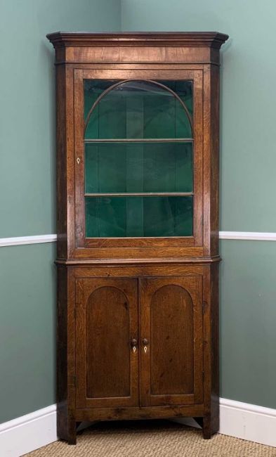 19TH CENTURY WELSH OAK STANDING CORNER CABINET, glazed door with bone escutcheon, above cupoard base, 193cm h