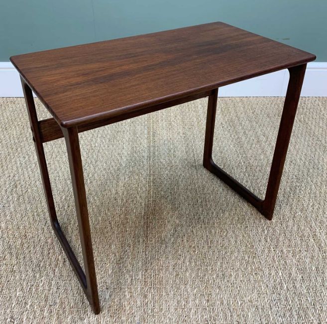 JOHANNES ANDERSON FOR CFC SILKEBORG: NEST DANISH ROSEWOOD OCCASIONAL TABLES, c. 1965, one with rattan woven shelf, labelled, largest 48.5h x 52.5w x 31.5cm d