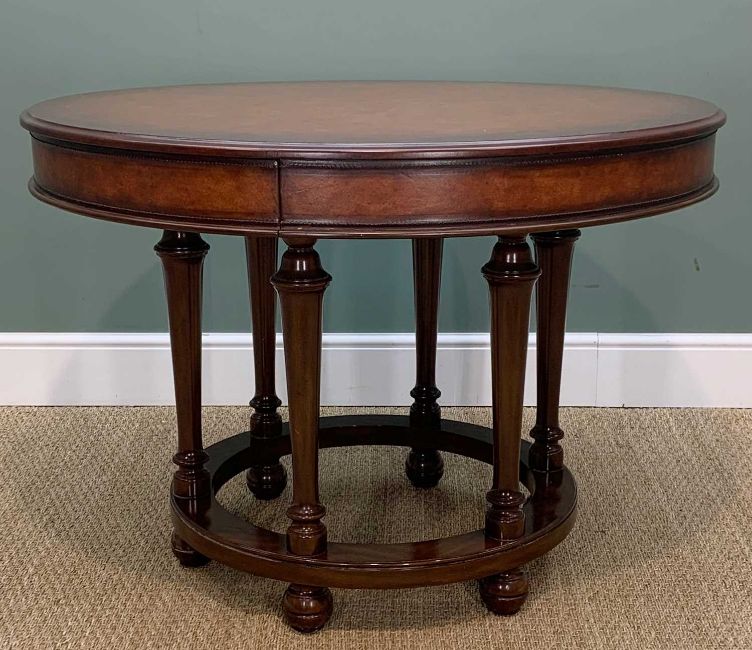 RALPH LAUREN HARDWOOD AND LEATHER CENTRE TABLE, fitted with frieze drawer, on six tapering legs on ball feet, 105cm diam. together with small occassional table, 73cm diam.(2)