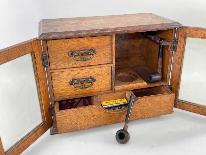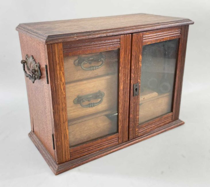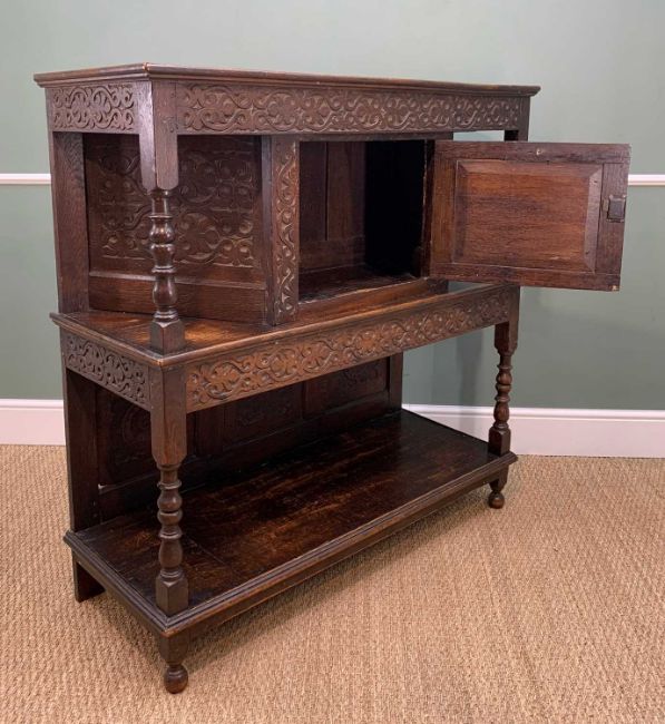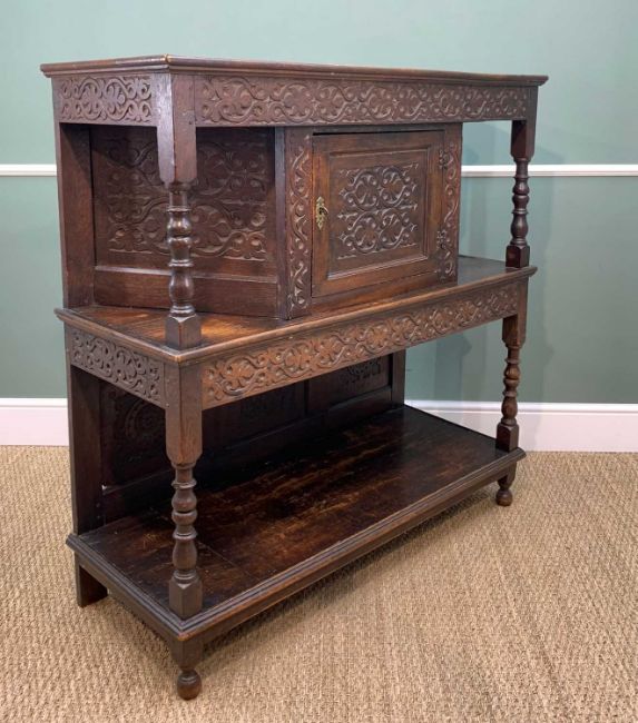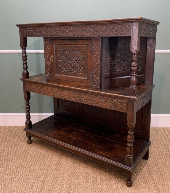 CHARITY LOT SUPPORTING OUR 2023 NOMINATED BENEFICIARY TENOVUS CANCER CARE comprising an assortment of furniture as follows: ELIZABETHAN-STYLE OAK COURT CUPBOARD, later carved, 124 w x 47 d x 127 h cms, FRENCH POTATO SCALE, by Fayard Freres, 84cms high, VICTORIAN OVAL WALL MIRROR, 56 x 67cm, MAHOGANY & WALNUT DRESSING TABLE MIRROR, 42W x 21.5d x 66cms h (a marriage), EDWARDIAN OAK SMOKER'S CABINET, with content, 29h x 39w x 19cm d, SMALL EARLY 20TH CENTURY STAINED BEECH ROCKING CHAIR, ASSORTED OCCASIONAL FURNITURE, including two-tier etagere, George III mahogany box base dressing table mirror, set 4 distressed side chairs with leather upholstery and a further three assorted side chairs not pictured, 20TH CENTURY MINIATURE DUTCH CABINET, QUEEN ANNE-STYLE WALNUT DRESSING TABLE MIRROR