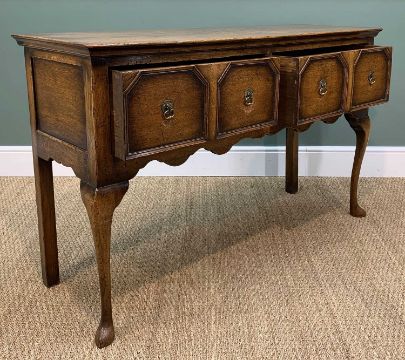 TWO REPRODUCTION OAK TABLES; comrpising low dresser with geometric fronted frieze drawers, 83h x 137w x 46cm d, and low cupboard with drop leaf top, turned legs, stretchers, 87h x 136w x 31.5cm d (2)