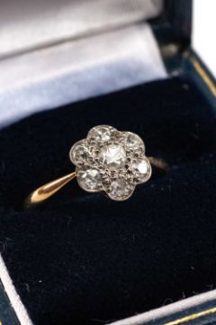 18CT GOLD DIAMOND SEVEN STONE CLUSTER RING, the seven stones totalling 0.4-5cts overall approx., ring size N, 3.8gms, in Heirloom Antiques of Haverfordwest ring boxProvenance: deceased estate Pembrokeshire