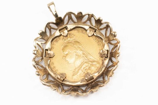 VICTORIAN GOLD SOVEREIGN, 1890, Jubilee head, in 9ct gold pierced floral pendant mount, 12.9gmsProvenance: private collection Pembrokeshire