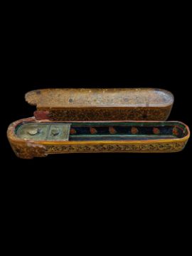 LACQUERED PAPIER-MACHE QALAMDAN (SCRIBE'S PEN BOX), Persia or Kashmir, 19th Century, painted and gilded with flowers within line borders, the interior with foliate decoration on a blue ground, with brass inkwells, 29.5cm long