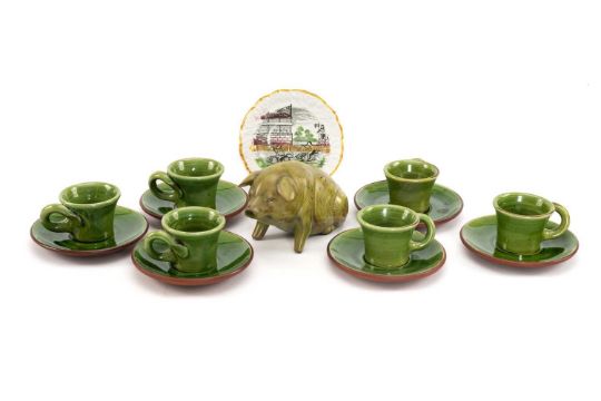 EWENNY POTTERY PIG, green glazed, loin inscribed 'Y Mochyn Bach', signed base, 17cms long together with a Ewenny Pottery set of six green glazed coffee cups and saucers, and rare Ynysmeudwy Pottery nursery plate, transfer decorated with 'The Pig Race', within floral moulded border and mustard rim, 13cms diam (14)