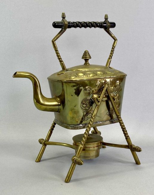 BRASS TEA KETTLE - of rectangular form with floral embossed decoration and with ebonised twist handle, on open stand with burner, 33cms H, a pressed glass inkstand, 5cms H, 90.5cms W, 14cms D, brass jug of tapering cylindrical form with loop handle, 24cms H, EPNS hip flask with engraved decoration, ETC
