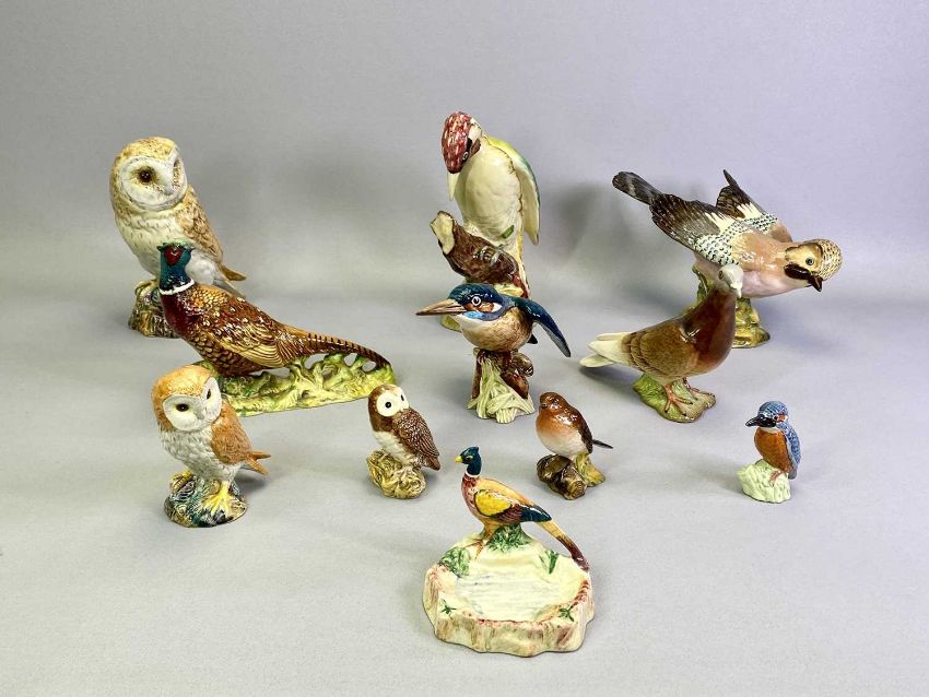 BESWICK GROUP OF BIRDS - Jay Model No 1219, 14cms H, Green Woodpecker Model No 1218, 22cms H, Barn Owl Model No 1046, 19cms H, Pigeon Model No 1383, 14.5cms H, Pheasant Model No 1226, 15cms H, ETC