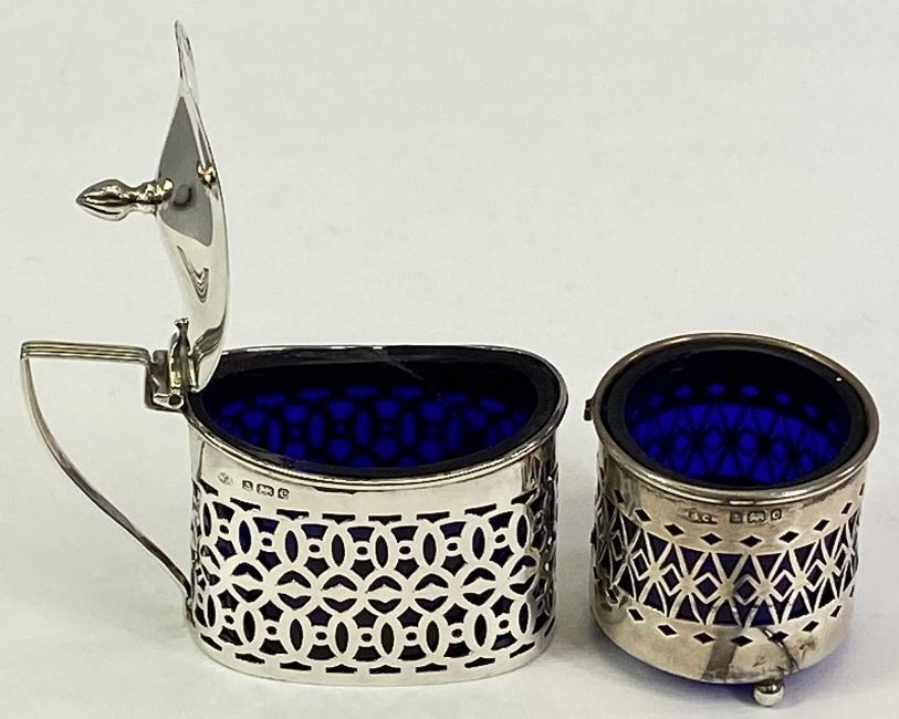 SILVER TABLE CONDIMENT ITEMS (15) - having various Birmingham and Sheffield hallmarks to include three lidded mustard pots, two having pierced detail to the bodies, all have blue glass liners, 6cms H, 8.5cms across the largest along with four various salt spoons, Birmingham marks and makers, a pair of Sheffield circular salts on ball feet, date marked 1909, maker Atkin Brothers, both have engraved monogram initials and date 1871-1896, 3cms H, 5cms diameters, a pair and two others hallmarked salt/mustard spoons, Sheffield makers along with two EPNS mustard spoons stamped "Arthur Price of England", 6.3ozt weighable