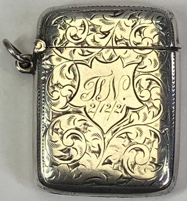 BIRMINGHAM SILVER CIGARETTE CASE & VESTA CASE - the cigarette case date marked 1910, maker Williams, Birmingham Ltd, 8.5 x 7cms and the vesta case, 1900, maker J R Ltd, 5 x 4cms, both items having monogrammed cartouches, 3ozt gross