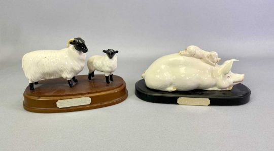 BESWICK GROUP - black faced sheep and lamb on oval plinth, 11.5cms H, cream glazed begging dog, Model 324, 18.5cms H, a pair of seated spaniels, Model 1378/6, 15cms H, seated puppy, 11cms H and pig and piglet group on oval plinth 'Piggyback', 19cms L
