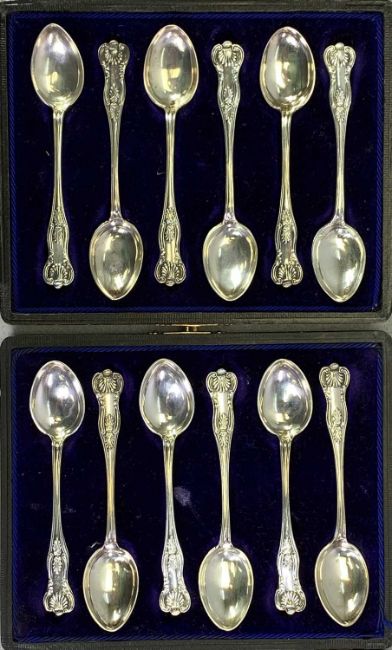 TWO CASED SETS OF SIX KINGS PATTERN TEASPOONS - Maker William Devenport, the first set of six having various dates, Birmingham 1903-1905, the other set of six all dated Birmingham 1906, 11cm lengths, 5.3ozt gross