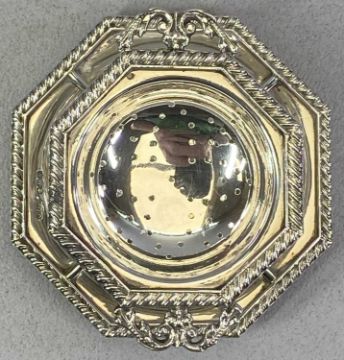 SILVER TEA STRAINER ON STAND - Sheffield 1938, maker Gladwin Ltd, twin handled octagonal shaped strainer with rope pattern edging, repeated to the base, 5cms H overall, 10cms across the base, 5.5ozt