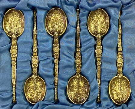 SILVER & ENAMEL/SILVER GILT TEASPOONS/TWO CASED SETS OF SIX - the enamelled set decorated to the bowl backs in floral pattern with guilloche enamel with ribbed handles, Chester 1939, Maker Walker & Hall, in original box, 10cm lengths, and a set of silver gilt anointing spoons, London 1935 Silver Jubilee mark, Saunders, Shepherd & Co Ltd, 9.25cm lengths, with original description card, 4.1ozt gross