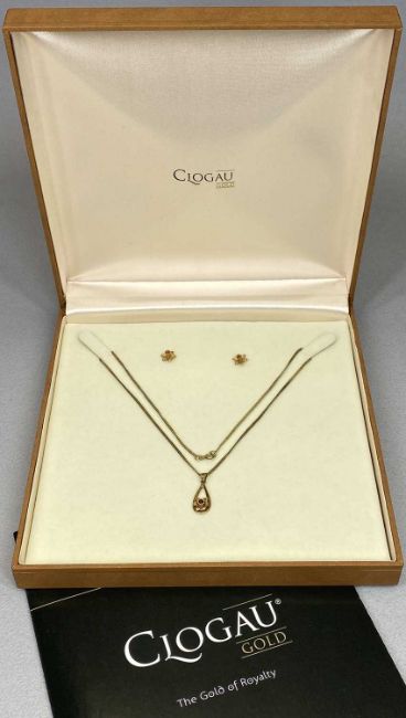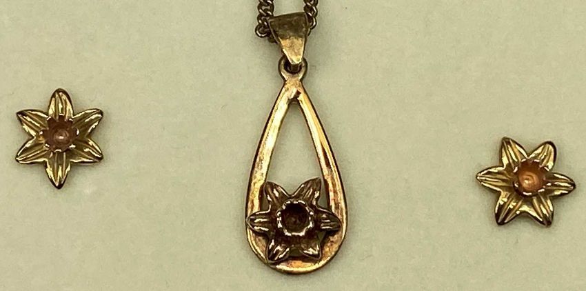 CLOGAU 9CT GOLD DAFFODIL PENDANT NECKLACE & EARRINGS SET - in original presentation box with certificates, 25cms overall L the necklace, the stud earrings 10mm diameter, 6.6grms gross