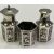 CHINESE UNMARKED WHITE METAL THREE PIECE CONDIMENT SET - comprising pepper pot, salt and lidded mustard pot, all hexagonal form with individual panels of flora in relief and figures seated in a garden setting, one panel to the salt having Hanzi/character markings, 8cms H the tallest, 138grms